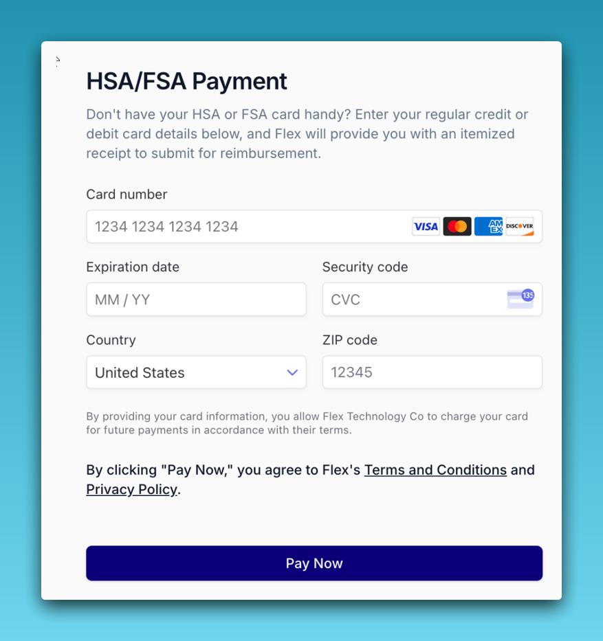 Flex is our payment partner that enables you to use your HSA or FSA benefits securely and easily. Think of it like Klarna or Affirm — but for health-based payments.